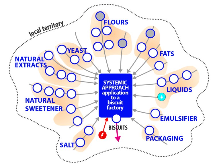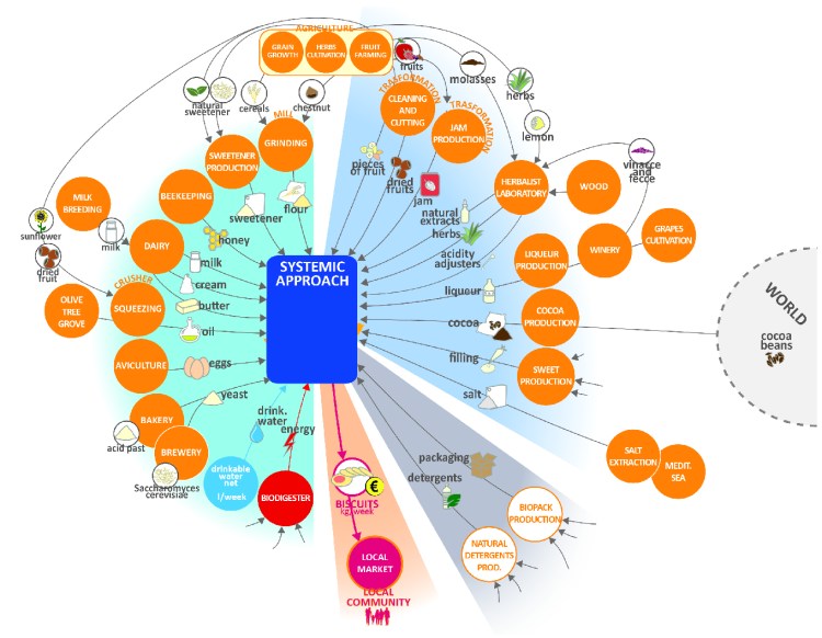 In this research project the Systemic Design approach was applied to a specific production process: a large biscuit factory. It started with the Holistic Diagnosis of the territory where they are located, considering many aspects, from the geography, to the economy and culture as particular dishes. At the same time the current production model was analysed . This study was performed thanks to many field visits in the territory and in the factory, and thanks to the collaboration of the employees with many meetings in person and workshops. This process has also permitted to increase the employees’ awareness on the current situation, and afterwards guiding the enterprise towards a different and systemic production model to produce zero waste.