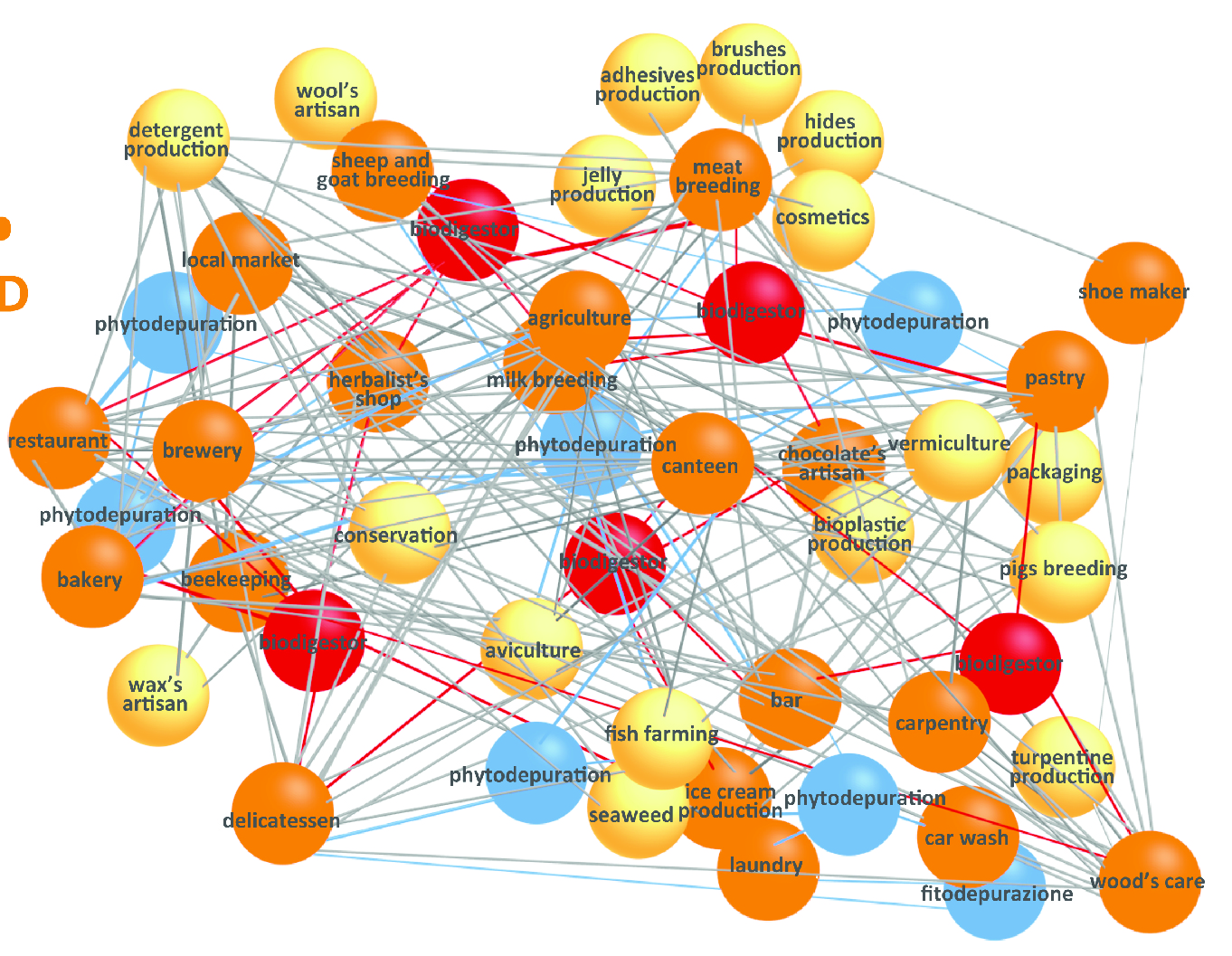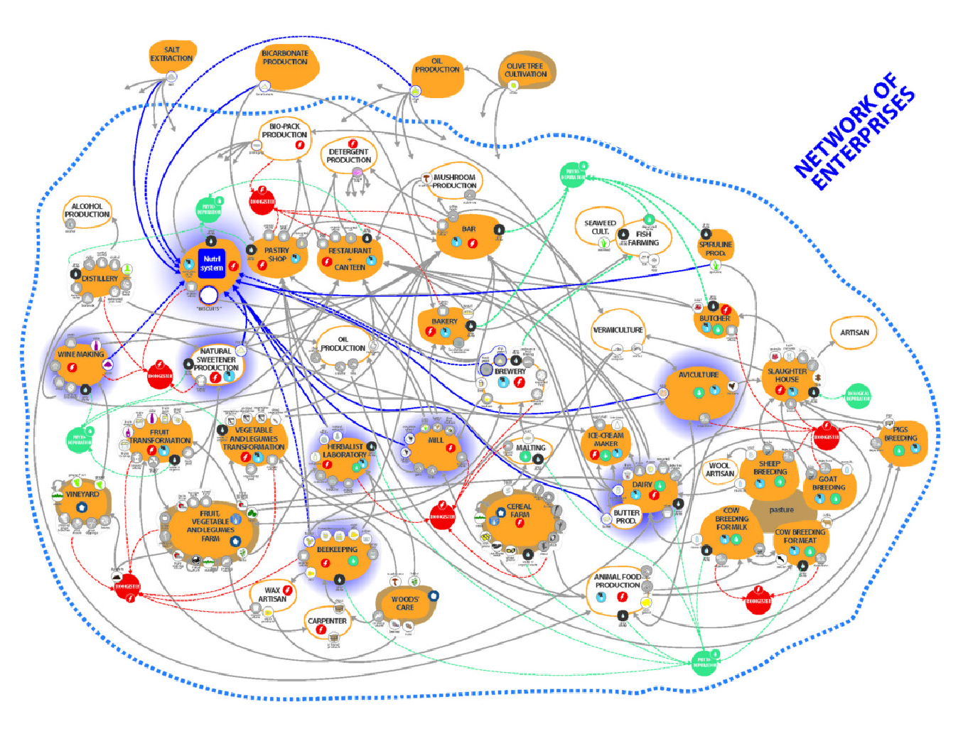 The analysis went in depth in the principal productive activities in the area (24 typologies) – focusing on the micro-small activities – redefining their production processes with the guidelines of the systemic design. Thanks to this work, it was possible to create a net of relations between them, working on the flows of matter and energy that go from one productive process to another one. The conclusion was the creation of a macrosystem (‘the system of the system’) in which was demonstrated how the definition of the net can create new activities, thanks to the generative characteristic of the systemic design (24 can create 26 new activities).