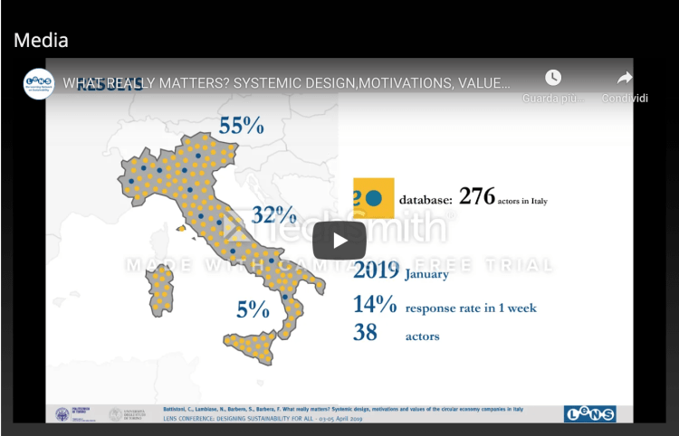 Since 2014, the Circular Economy (CE) concept is gaining an important role in the European context thanks to the specific direction given by the EU policy. This research wants to frame Italian companies who are working on CE context to understand mainly which is their approach and awareness to CE and if the design is playing a role in this transition. At the beginning of 2019, an online questionnaire was sent to the actors present in the app database ‘Mercato Circolare’ who, since March 2017, is mapping the Italian situation collecting the actors related to the CE selecting companies, events and experiences of circular citizenship. Despite the response rate was 14%, the results are interesting: 100% are SMEs; 21% are not aware to work on CE; >52% identified difficulties with value appreciation; design competencies are present in the 66% of realities and in 29% the designers by formation are founders.